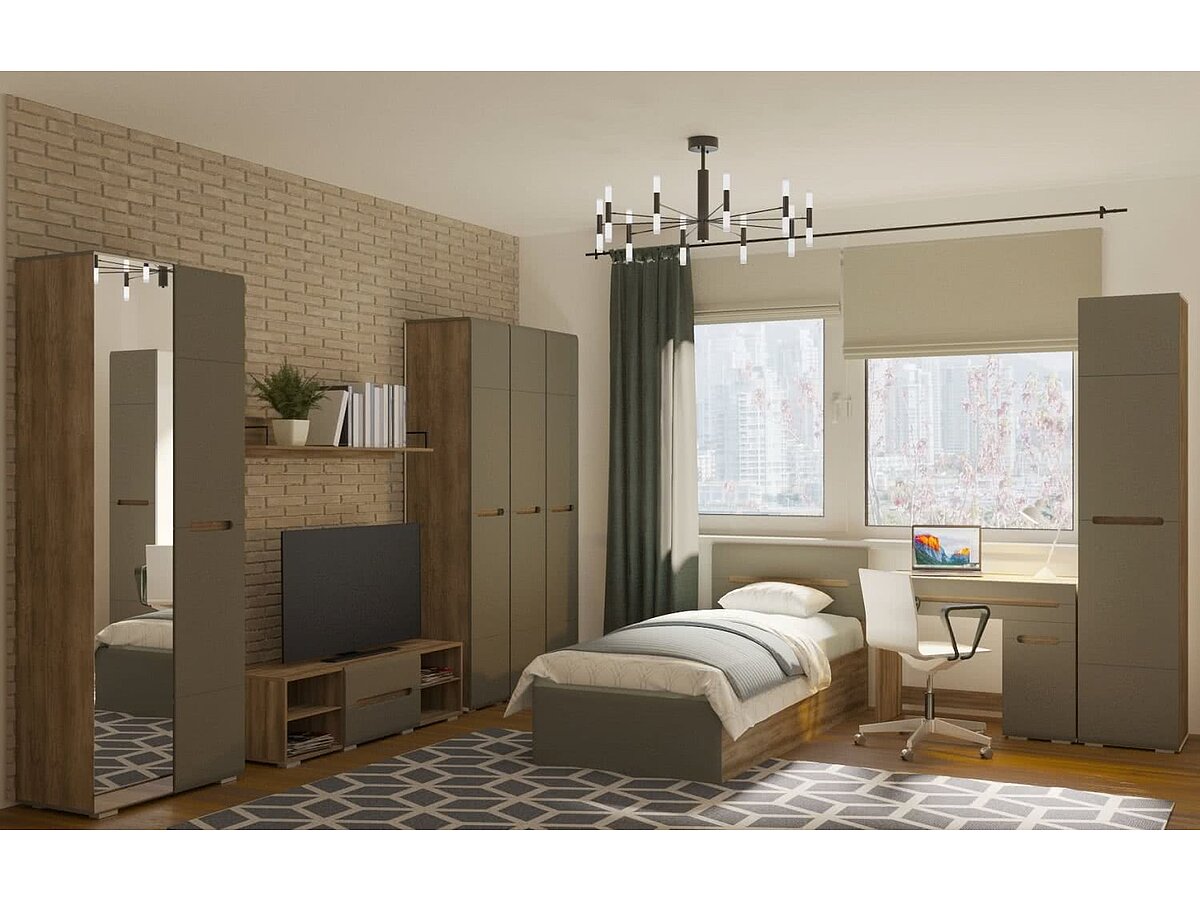 Контрастность сочетания матового декора корпуса элитного дерева «Дуб Каньон» с матовым серым создает теплую атмосферу. Оригинальное конструктивное решение коллекции – ручки фасадов, выполненные путем сложной фрезеровки и подчеркнутые углубленным декором дубового спила.
