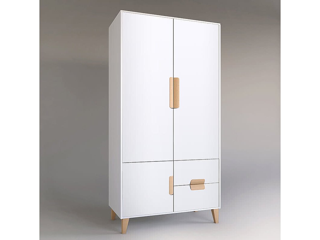 Двухдверный шкаф Квадро, такой модуль необходим для любой детской. В нем имеется два выдвижных ящика для детских мелочей, секция со штангой и верхней полкой и отделение с полками. Корпус белого цвета, фасады комбинированные. Ручки и ножки выполнены из массива дуба, покрыты прозрачным лаком.