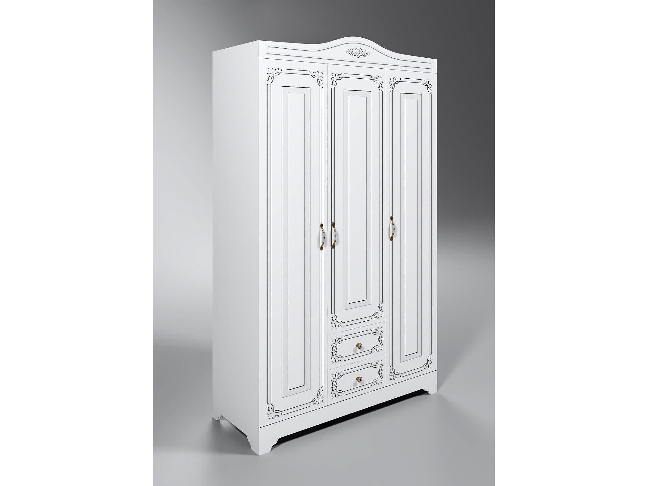 Трехстворчатый шкаф Ноктюрн - функциональный модуль для хранения одежды на плечиках и белья в сложенном виде. Шкаф состоит из узкой секции с полками и широкой (штанга и полка) с выдвижными ящиками (шариковые направляющие). Внутреннее наполнение хорошо показано на схеме в доп. изображениях. Система открывания дверей - петли с доводчиками. Серия отличается наличием резного цоколя и короной сверху.