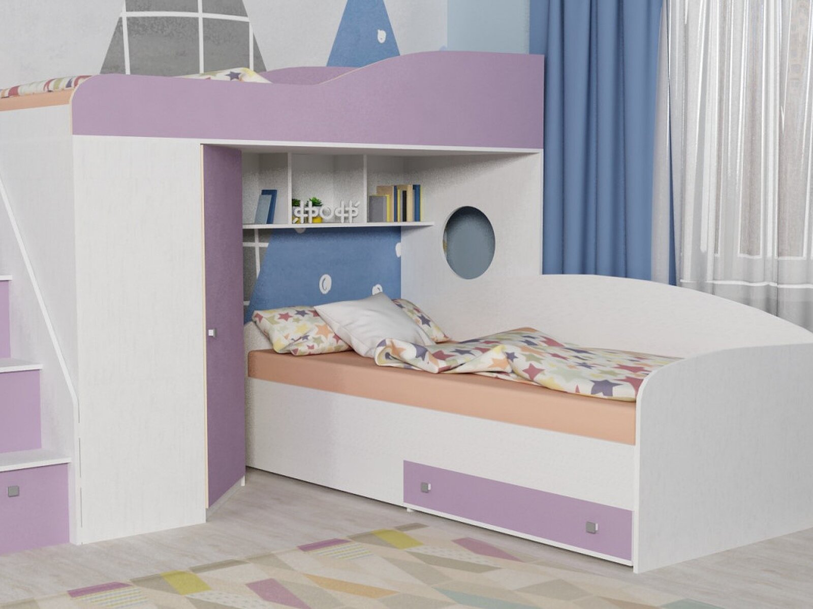Такая кровать придется по душе и ребенку младшего школьного возраста, и подростку. Два просторных спальных места, четыре глубоких вместительных выдвижных ящика, замаскированных под ступеньки, вертикальный шкаф для одежды и компактные полочки для сувениров - все это дает колоссальную экономию места в Москве. Это особенно актуально для небольших малогабаритных помещений. Сочетание прямых, диагональных и плавных линий создает оригинальный дизайн.