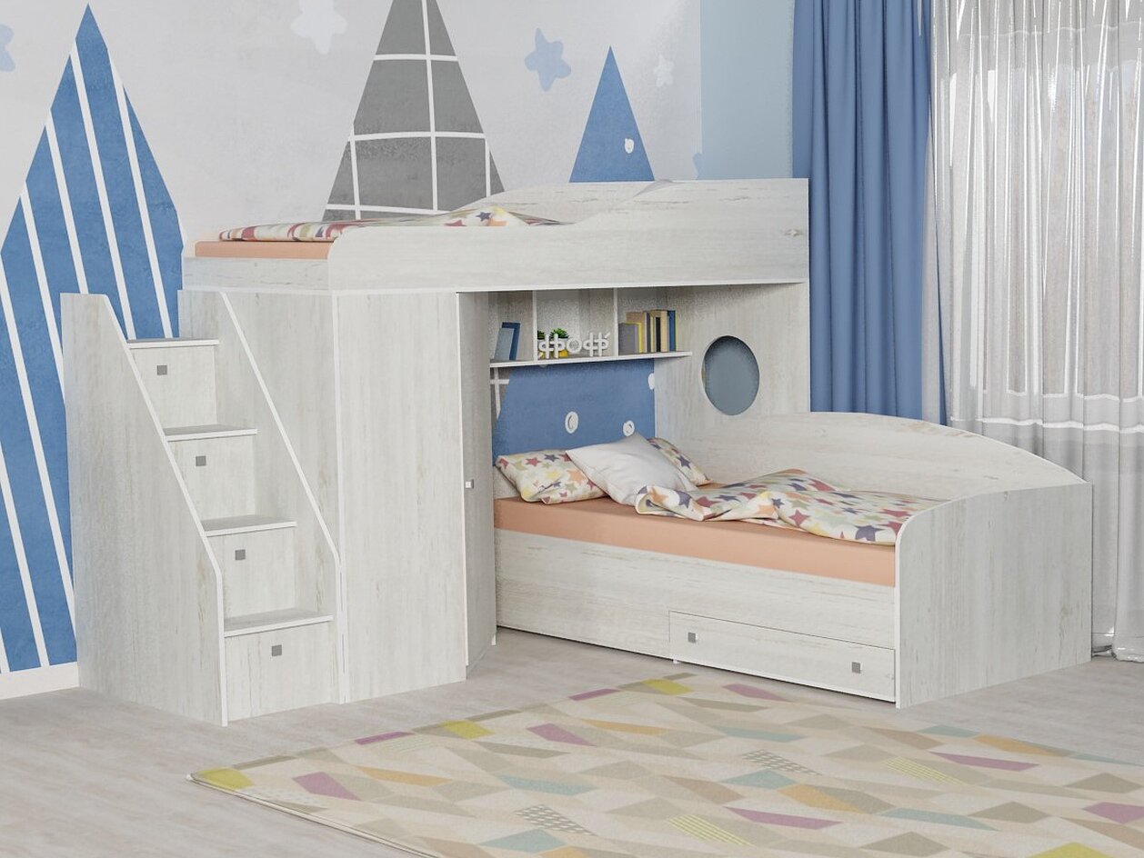 Такая кровать придется по душе и ребенку младшего школьного возраста, и подростку. Два просторных спальных места, четыре глубоких вместительных выдвижных ящика, замаскированных под ступеньки, вертикальный шкаф для одежды и компактные полочки для сувениров — все это дает колоссальную экономию места. Это особенно актуально для небольших малогабаритных помещений. Сочетание прямых, диагональных и плавных линий создает оригинальный дизайн.