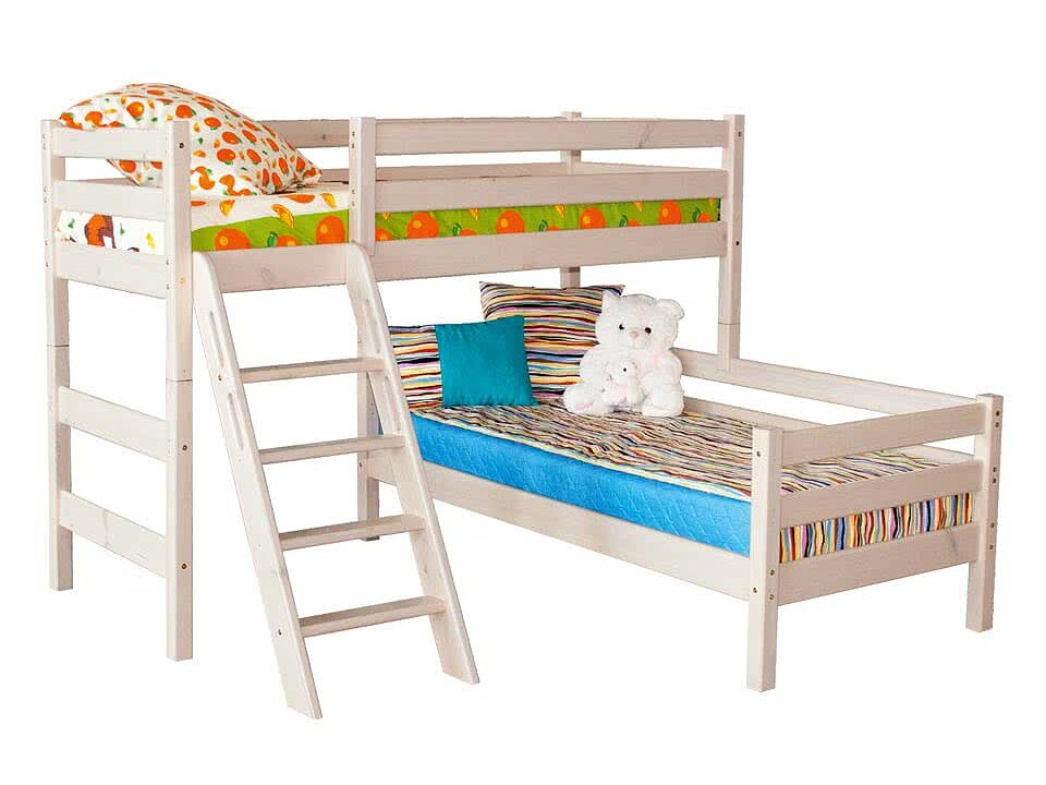 Кровать Соня угловая с наклонной лестницей, вариант 8 изготовлена из массива дерева. Натуральность, экологичность и надежность — главные преимущества этой деревянной кровати.