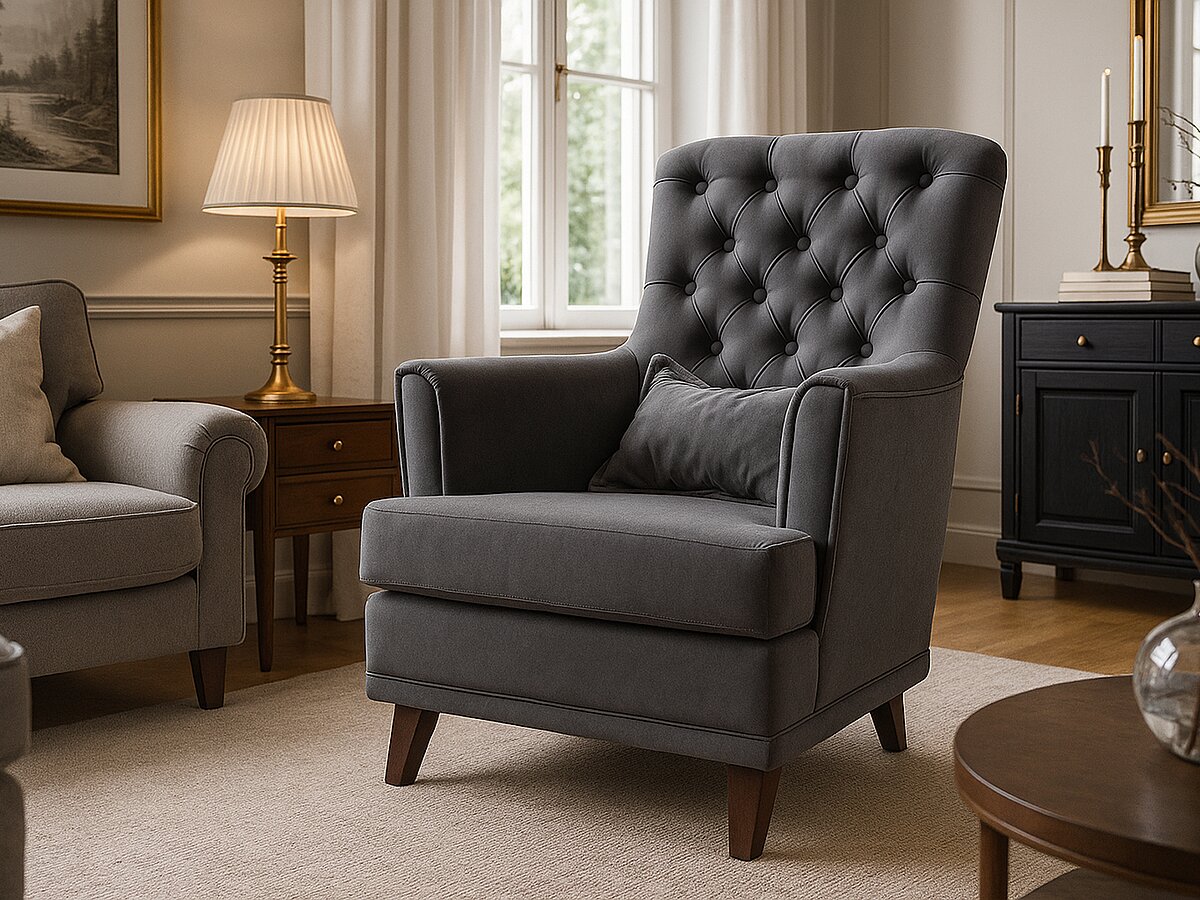 Кресло с высокой спинкой - это элегантный элемент интерьера, который сочетает в себе стиль и комфорт. Высокая спинка обеспечивает отличную поддержку и создает ощущение защищенности, а каретная стяжка добавляет изысканности и текстурного разнообразия.