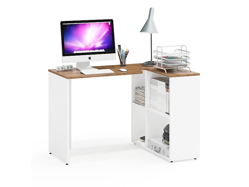 Стол-трансформер с тумбой на четыре полки с возможностью сборки в трех вариантах — два угловых и один прямой. Этот стол идеально адаптируется к любому пространству и потребностям.