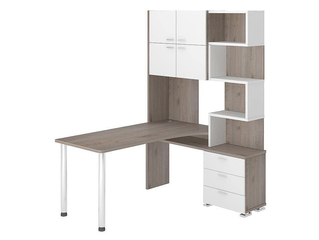Стол оснащён вместительной тумбой с тремя выдвижными ящиками для хранения канцелярии, документов и других необходимых вещей. Надстройка со шкафчиками и открытыми полками помогает поддерживать порядок, скрывая от глаз всё лишнее и оставляя под рукой важные предметы. Многоуровневая система хранения позволяет расставить книги, декор и оргтехнику, а также использовать корзины или коробки для удобной организации пространства.