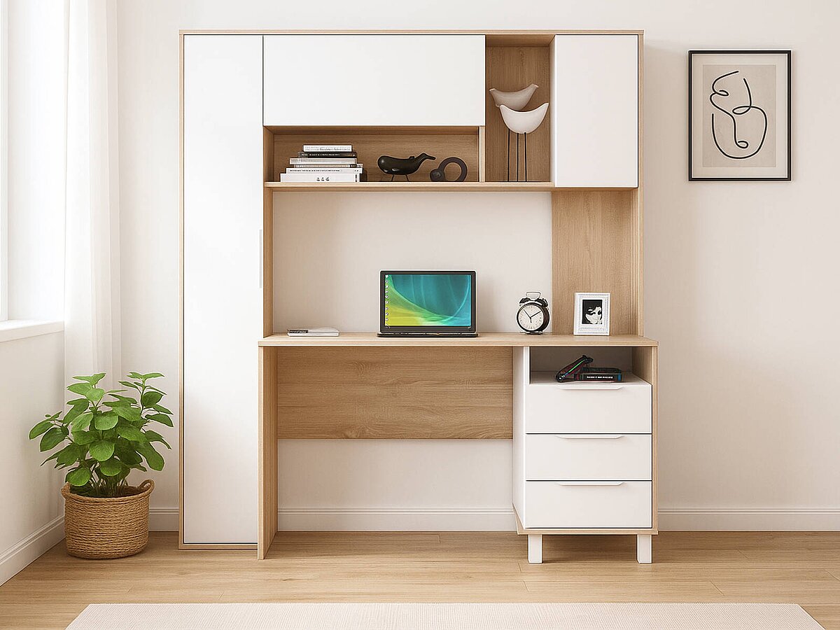 Продуманная конструкция стола - современный подход к процессу умственного труда, с большой столешницей и солидной системой хранения. Однотумбовый стол с тремя ящиками, надстройка с закрытыми и открытыми отделениями и пенал с пятью полками - эргономичный «кабинет» делового человека.