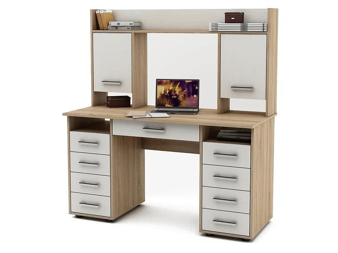 Стол оборудован вместительной надстройкой с полками и закрытыми отделениями для хранения книг, документов и аксессуаров, а также множеством выдвижных ящиков для канцелярии и личных вещей. Просторная рабочая поверхность легко размещает ноутбук, монитор и необходимые принадлежности, помогая поддерживать порядок и создавать комфортную атмосферу для учебы или работы.