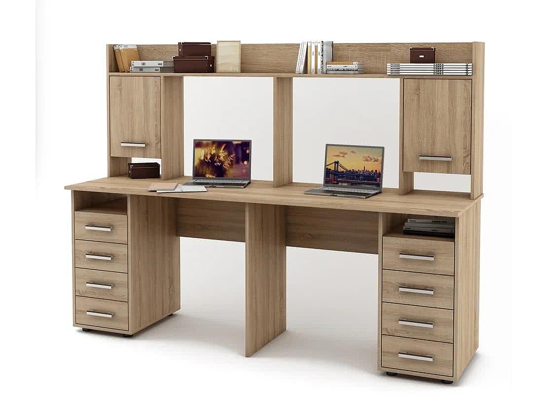 Просторная столешница обеспечивает комфортную работу для двух человек одновременно — идеальный выбор для семей с детьми, студентов, коллег или фрилансеров. Удобная надстройка с закрытыми шкафчиками и открытыми полками помогает поддерживать порядок и эффективно организовать хранение канцелярии, книг и аксессуаров.