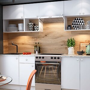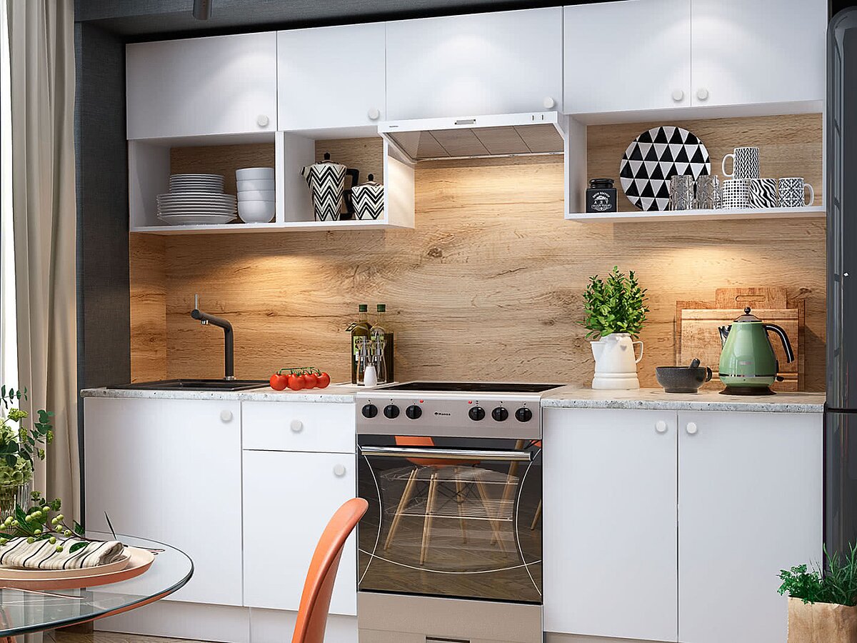 Бытовая техника, мойка, стеновая панель в комплект не входят.