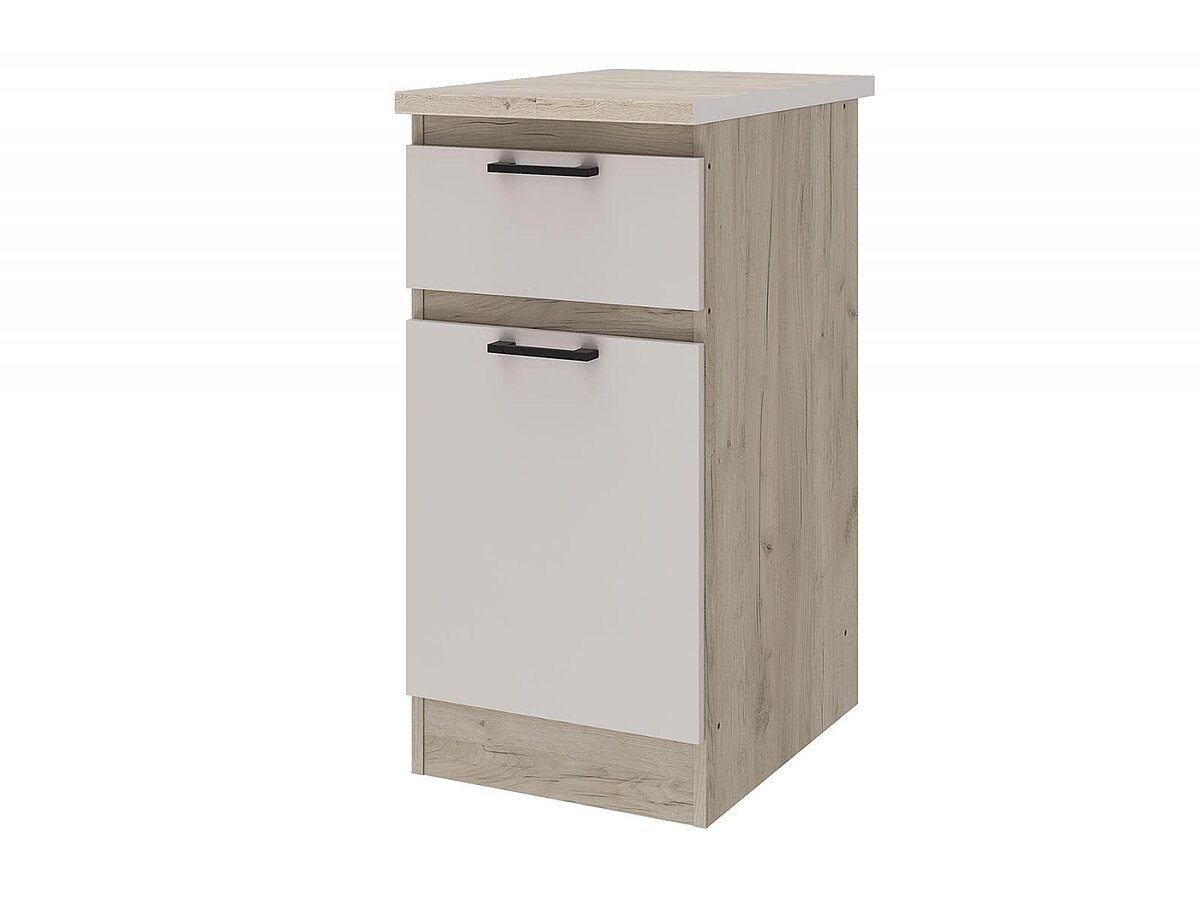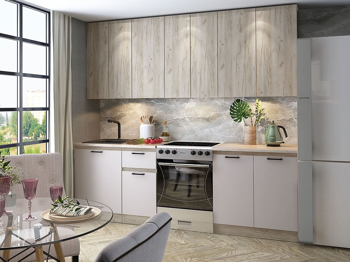 Все модули оснащены надёжными четырёхшарнирными петлями с доводчиком. Они обеспечивают плавное закрывание дверей и защищают их от повреждений. В комплект включена столешница из влагостойкого пластика (27 мм), имитирующая текстуру дуба «корсика». Она не деформируется от влаги и легко моется.