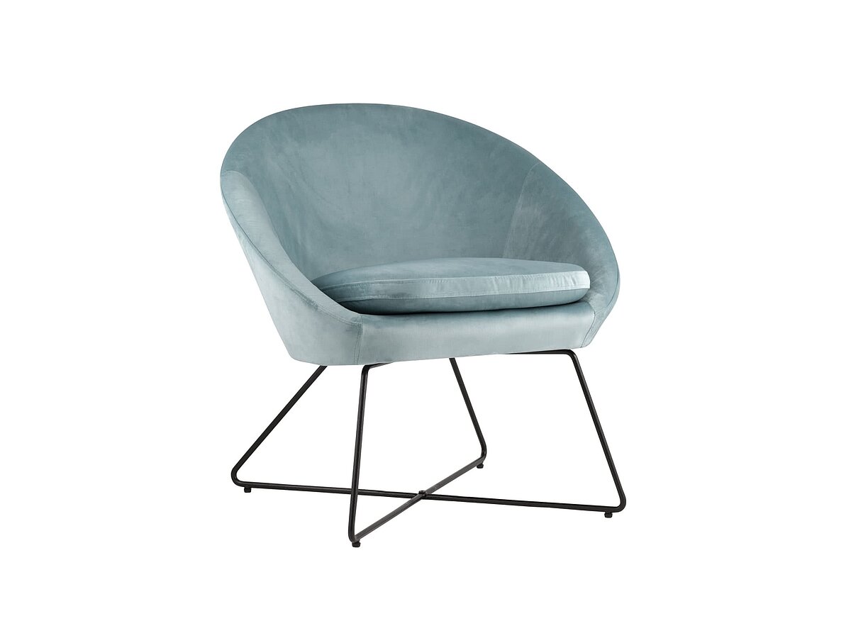 Широкая спинка плавно переходит в удобные подлокотники. Перекрещенные ножки изготовлены из металла и добавляют креслу оригинальности. Для дополнительного комфорта в кресле есть мягкое плотное сиденье. В качестве обивки используется велюр, приятный на ощупь. Металлический каркас добавляет устойчивости и выдерживает нагрузку до 120 кг.