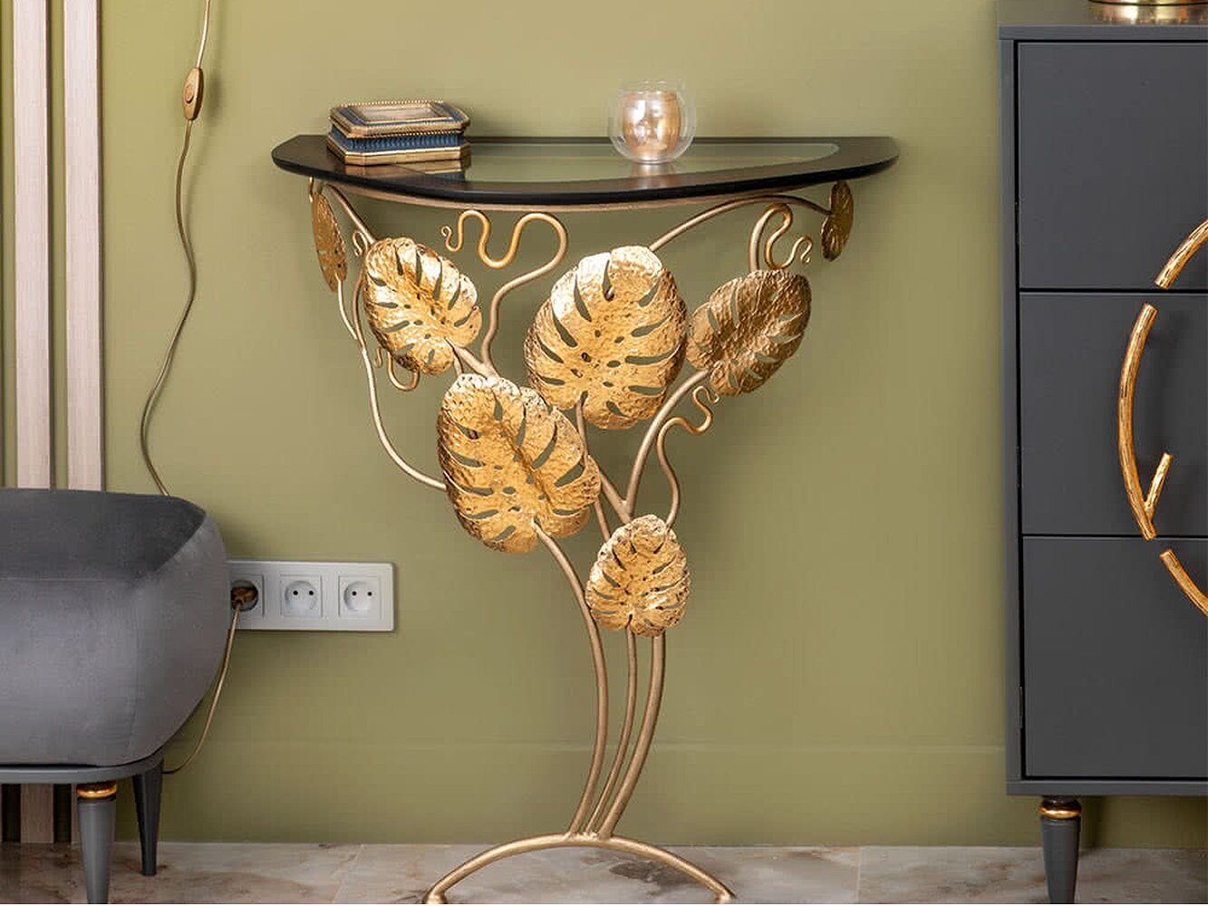 Удивительное сочетание тонкого изящества и трендового стиля в новой модели пристенной консоли Monstera Deliciosa. Консоль представляет собой прочную основу, которую украшают листья монстеры (кованая сталь), поддерживающую столешницу (мдф, стекло). Получается поистине необычная композиция, которой хочется любоваться. В интерьере такой декор выгодно дополнит современный стиль.В плане применения столик консоль довольно универсальная мебель. В комплекте с зеркалом, может использоваться как туалетный стол; поместите его в прихожую и у вас получится пристенный столик для декора, книг, косметики или даже поставка на ножках для цветов. Изысканный дизайн, функциональное применение!