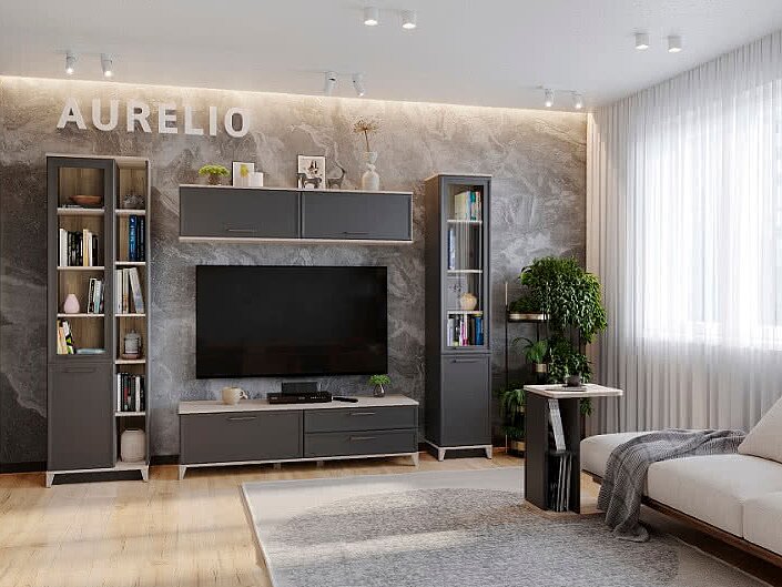 Модульная коллекция Аурелио – воплощение лучших черт классики в современном исполнении. Корпус мебели выполнен из высококлассного ЛДСП, фасад – МДФ в профиле. Рамочные фасады шкафов выглядят изысканно в сочетании со стеклом и металлическими черными ручками.