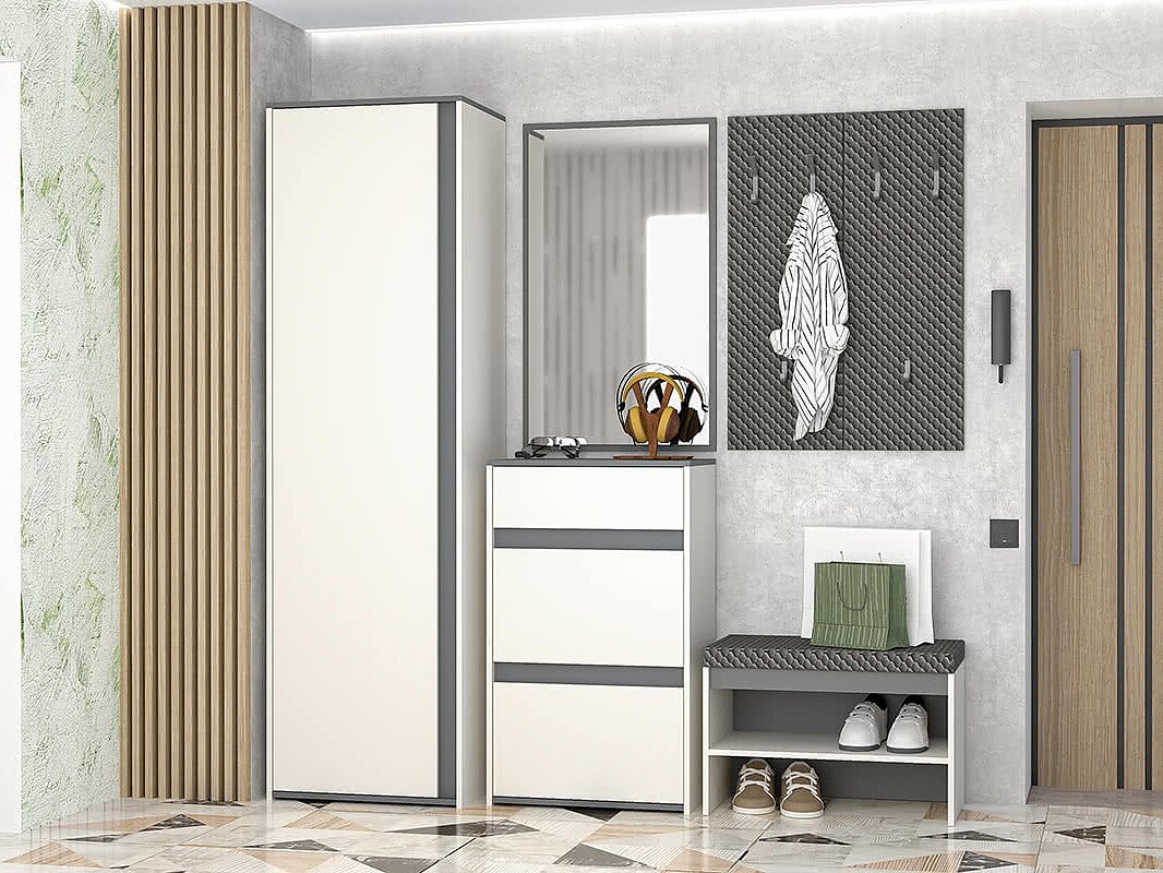 Маленькая прихожая Иннэс 12 – идеальное решение для компактного помещения. Светлые фасады визуально расширяют пространство, наполняя его воздухом и светом, а контрастные элементы графитового цвета подчёркивают строгость и лаконичность.