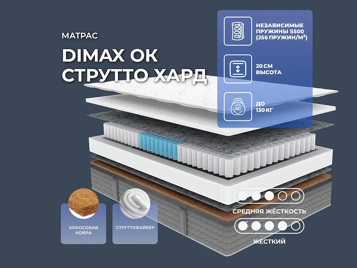 Преимущество матраса ОК Струтто Хард — он имеет 2 различные по жесткости стороны: жесткую и средне-жесткую.
