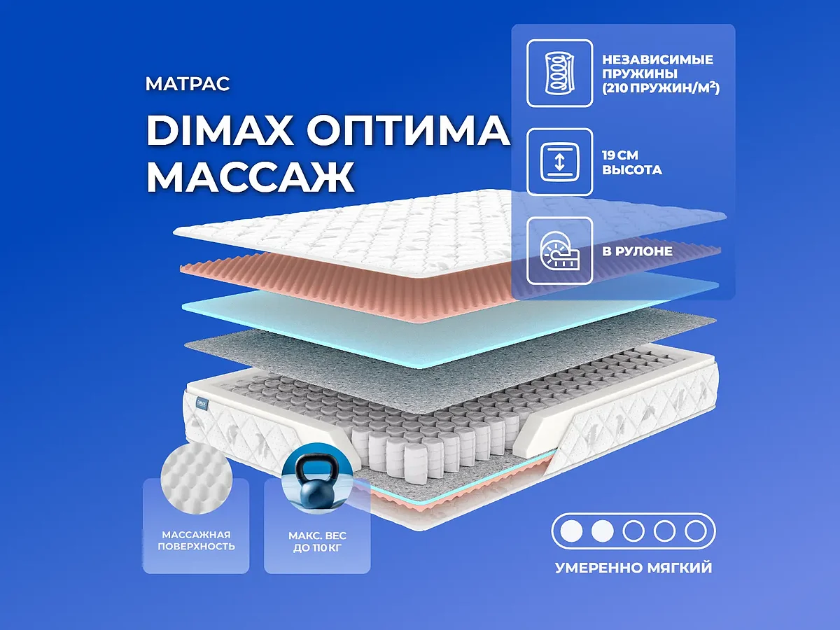 Матрас Оптима Массаж имеет среднюю толщину и подходит к большинству типов кроватей.