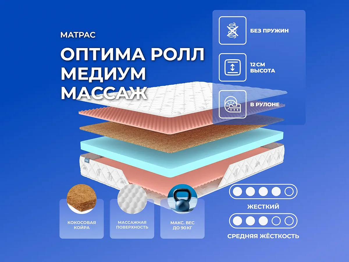 Преимущество матраса Оптима Ролл Медиум Массаж — он имеет 2 различные по жесткости стороны: жесткую и средне-жесткую. Хотите поменять жесткость — просто переверните ваш матрас.