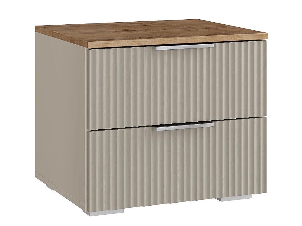 Фасады тумбы украшены вертикальным рельефом, который добавляет интерьеру динамики и актуальности. Модель оснащена двумя выдвижными ящиками — в них удобно хранить книги, аксессуары, зарядные устройства и другие мелочи, которые всегда должны быть под рукой. Верхняя поверхность тумбы отлично подойдет для декора: на ней гармонично смотрятся настольная лампа, часы, цветы или семейные фотографии.