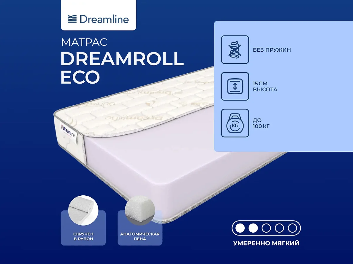 Матрас DreamRoll Eco имеет среднюю толщину и подходит к большинству типов кроватей.