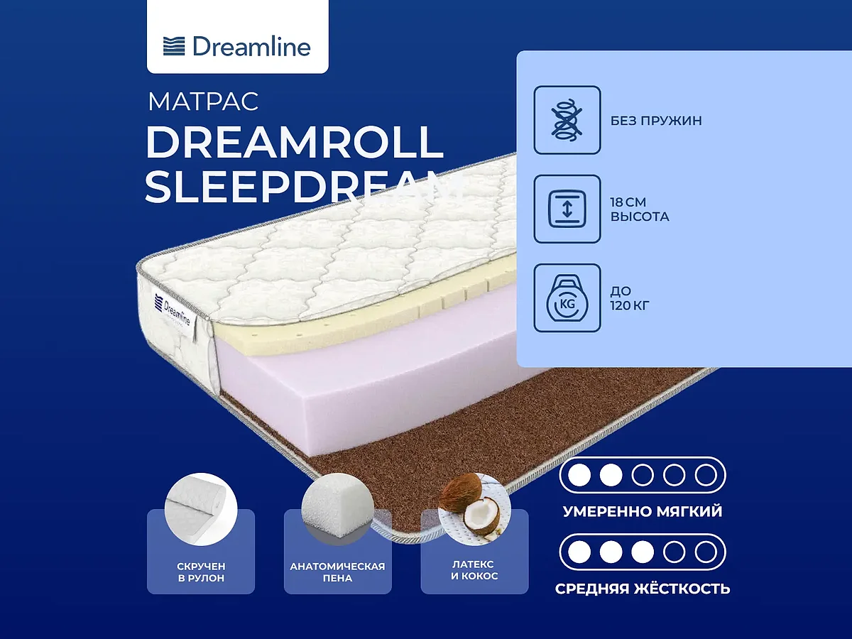 Матрас DreamRoll SleepDream относится к категории жестких. Такие матрасы рекомендуются для правильного формирования и сохранения позвоночника здоровым. Жесткий матрас предпочтителен для сна на спине.