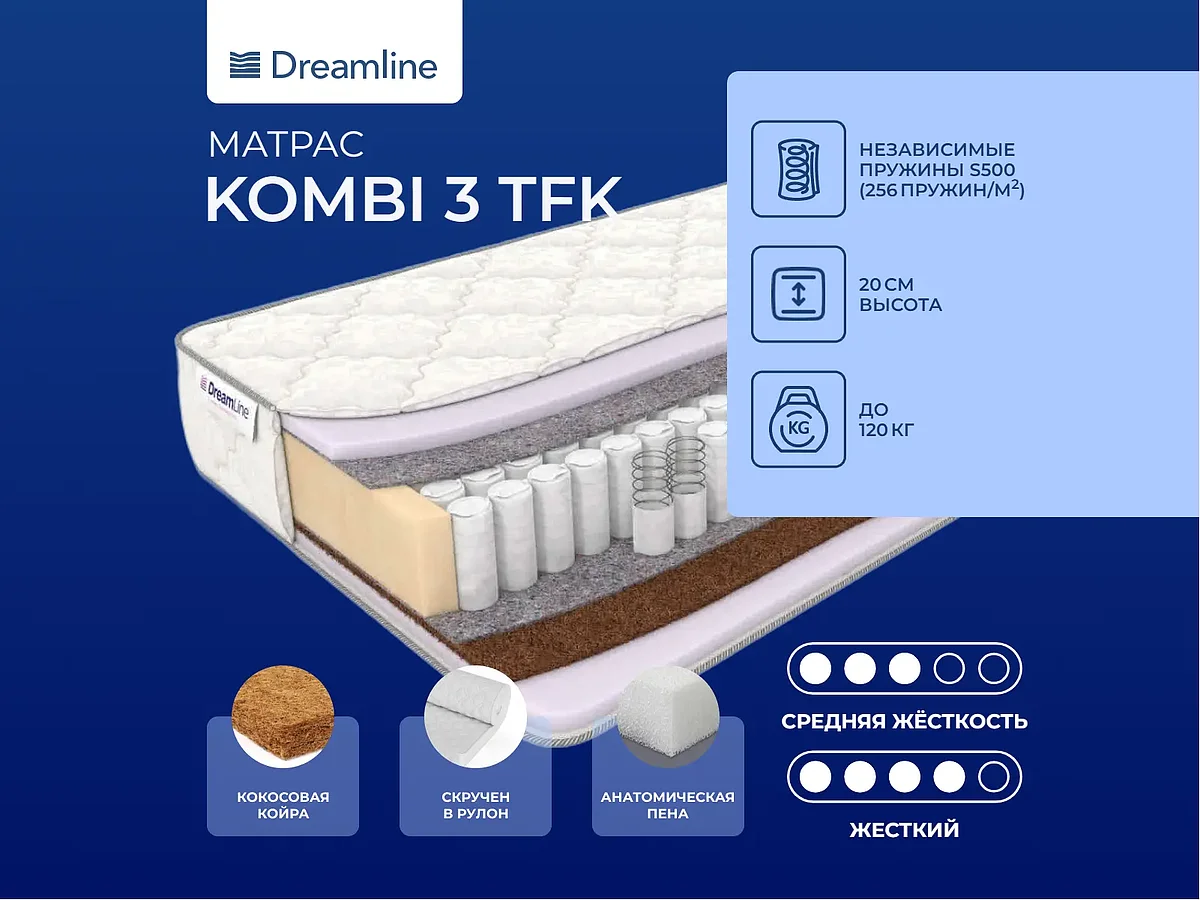 Преимущество матраса Kombi 3 TFK — он имеет 2 различные по жесткости стороны: жесткую и средне-жесткую. Хотите поменять жесткость — просто переверните ваш матрас.