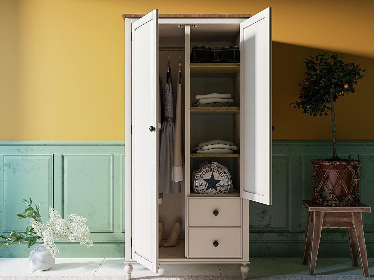 Внутреннее пространство шкафа разделено на отделение с перекладиной для одежды на вешалках и секцию с полками для аккуратного размещения сложенных вещей, коробок, текстиля или декоративных корзин. Два вместительных ящика в нижней части идеально подходят для хранения белья, аксессуаров, сезонных мелочей или документов.