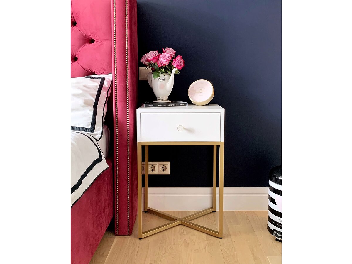 Стильная тумба с выдвижным ящиком на золотом основании. Столешница и ящик выполнены из МДФ, основание – металл. Эффектное сочетание белого цвета и золота, компактность и простые формы позволят данной модели стать украшением любого интерьера.