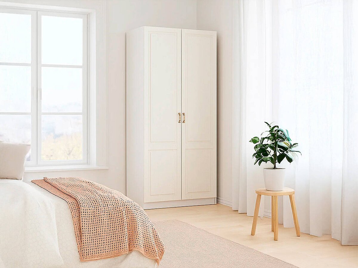 Стильный двустворчатый распашной шкаф со штангой для вешалок, четырьмя нишами для вещей и большим зеркалом на внутренней стороне дверцы - традиционная практичность гардероба с модным внешним лоском!