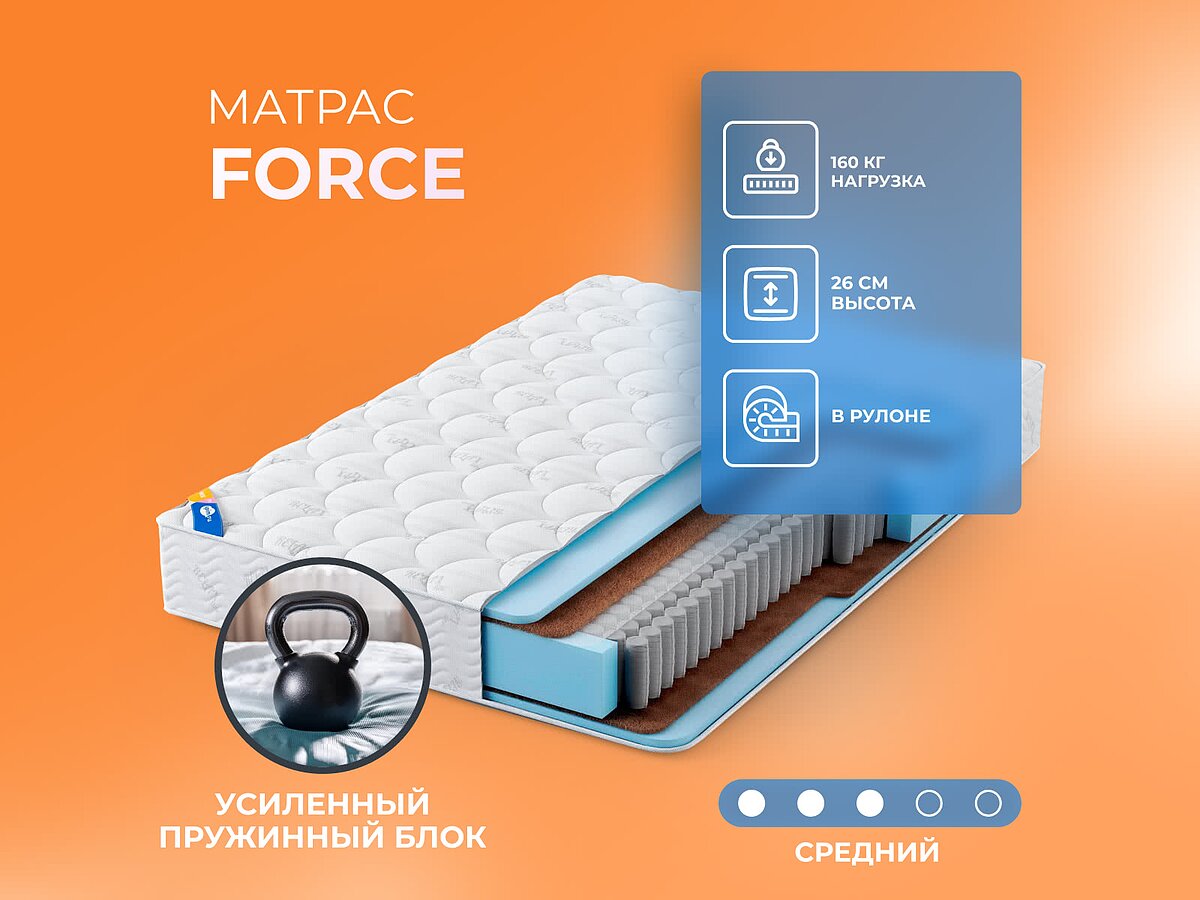 Матрас Force относится к моделям средней жесткости. Такая жесткость подходит большинству людей.