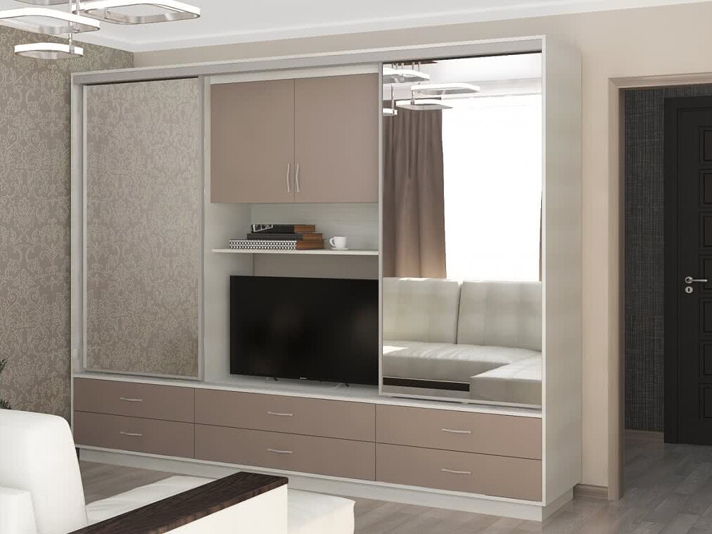 Двери шкафа-купе Мила купе с тумбой под ТВ могут оборудоваться зеркалами.