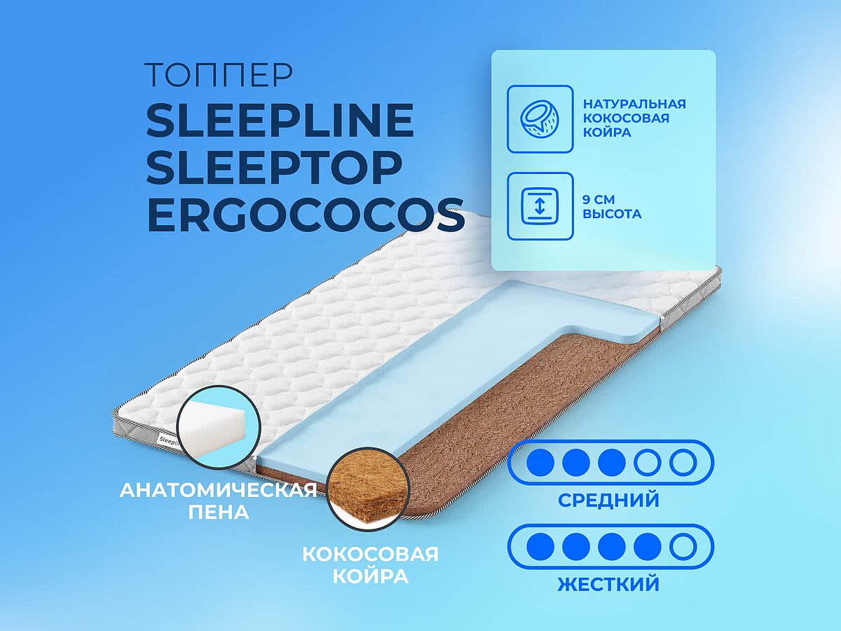 Матрас SleepTop ErgoCocos относится к категории тонких. Это матрасы, которые могут использоваться в качестве топперов, для изменения степени комфорта вашего матраса или дивана.
