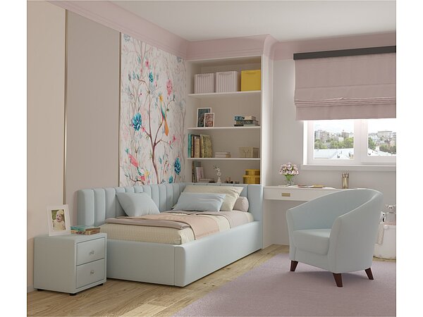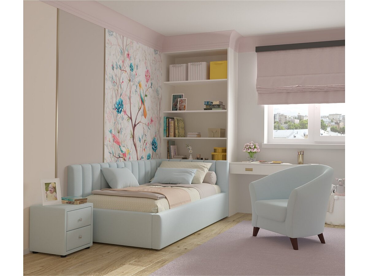 Конструкция и расположение спинок кровати Milena с подъемным механизмом (90) адаптированы для более удобного расположения в углу комнаты.